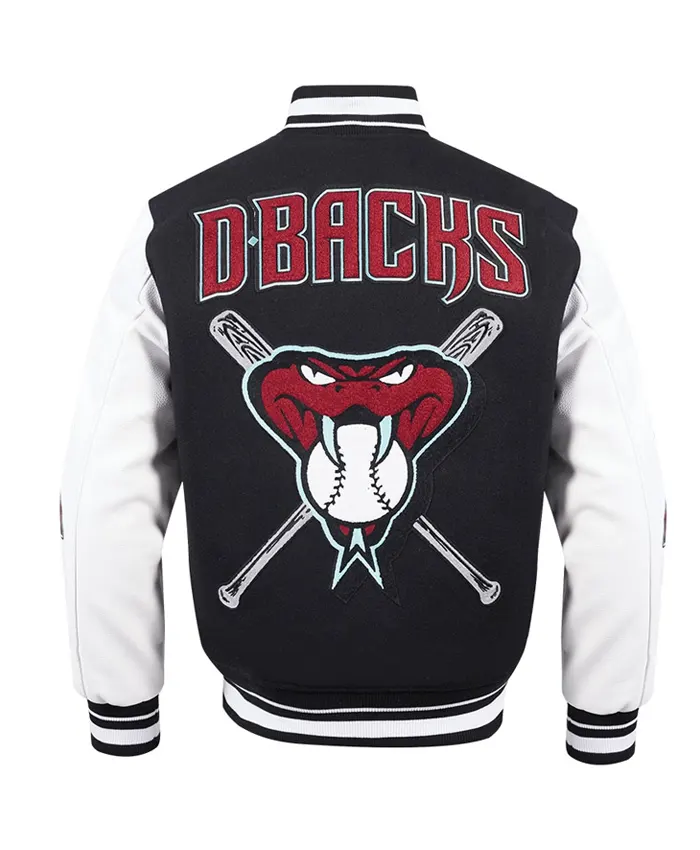 The Arizona Diamondbacks Mashup Full-Zip Varsity Black and White Jacket blends wool. And leather in a way that feels both strong and comfortable. Meanwhile, the soft viscose lining keeps the inside smooth, so wearing it for long hours never feels heavy. The rib knitted collar works perfectly with the snap buttoned front. Well, it also gives the jacket a structured shape without feeling stiff. Full-length sleeves flow into rib knitted cuffs. Which helps keep warmth in and the fit secure. And yes, the black and white color combo makes everything simple, sharp, and timeless.