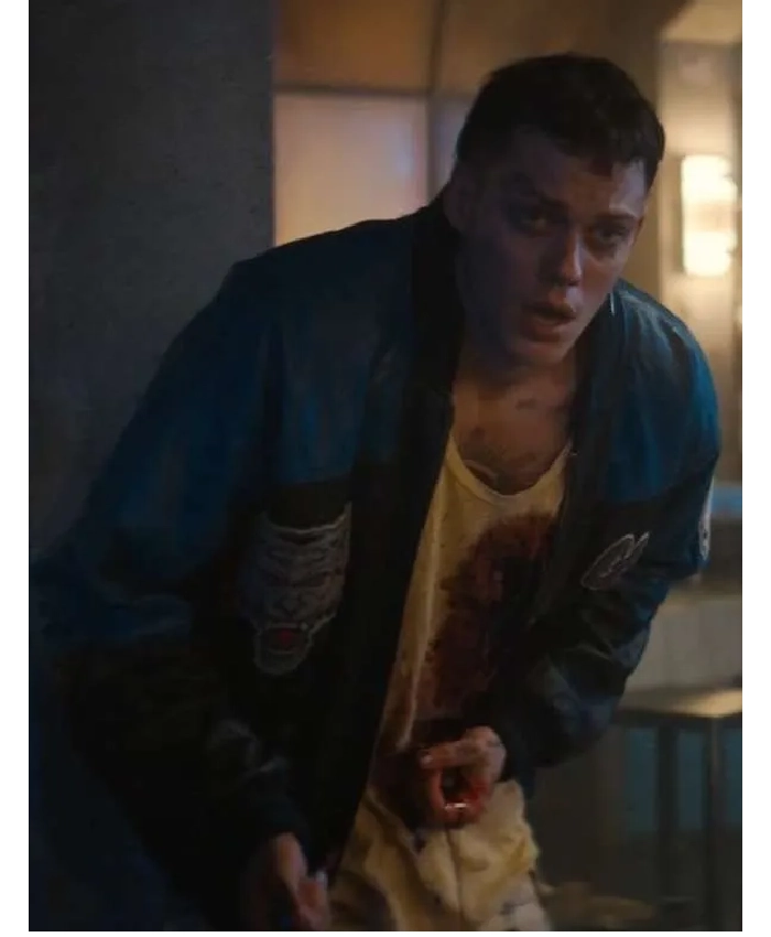 Buy Bill Skarsgård The Crow 2024 Eric Draven Blue and Black Bomber Leather Jacket For Sale