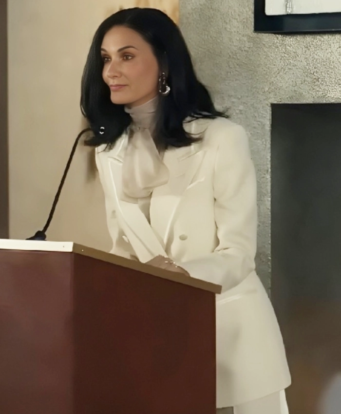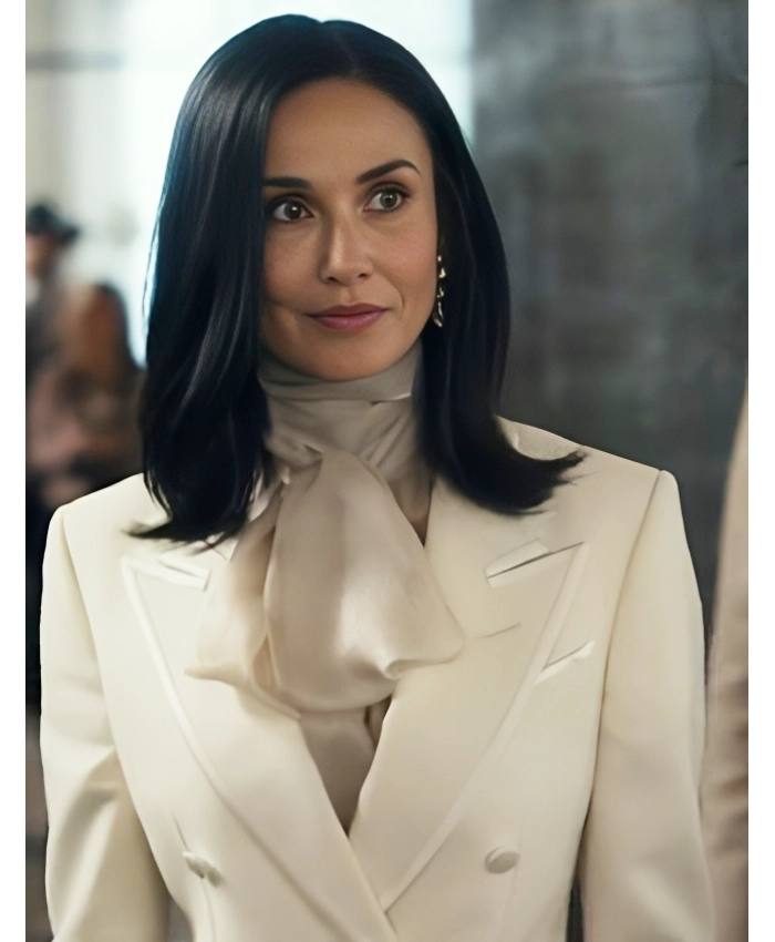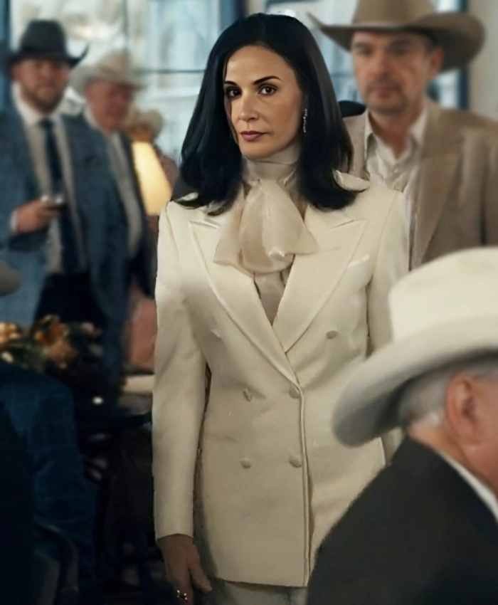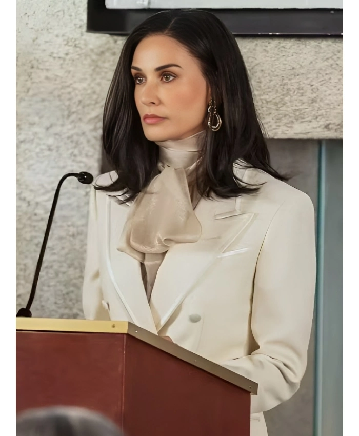 Since the start of the second season Cami has become a significant character for the main plot. Likewise, she is seen in some sophisticated attire which includes the Cami Miller TV-Series Landman S02 Demi Moore White Double Breasted Blazer. It is fashioned with suiting fabric that supports the bold and dynamic look. Beyond that, this blazer features long sleeves and a lapel style collar that enables an elevated style. You can surely try it on to your formal events and make a strong impact.