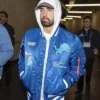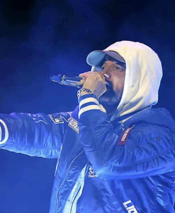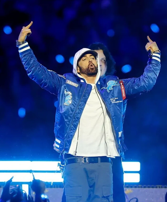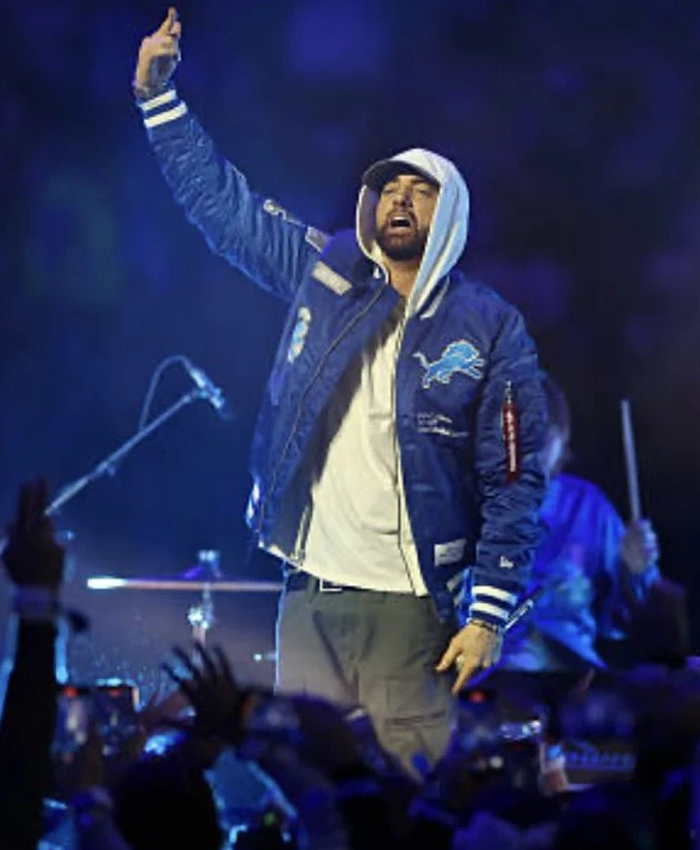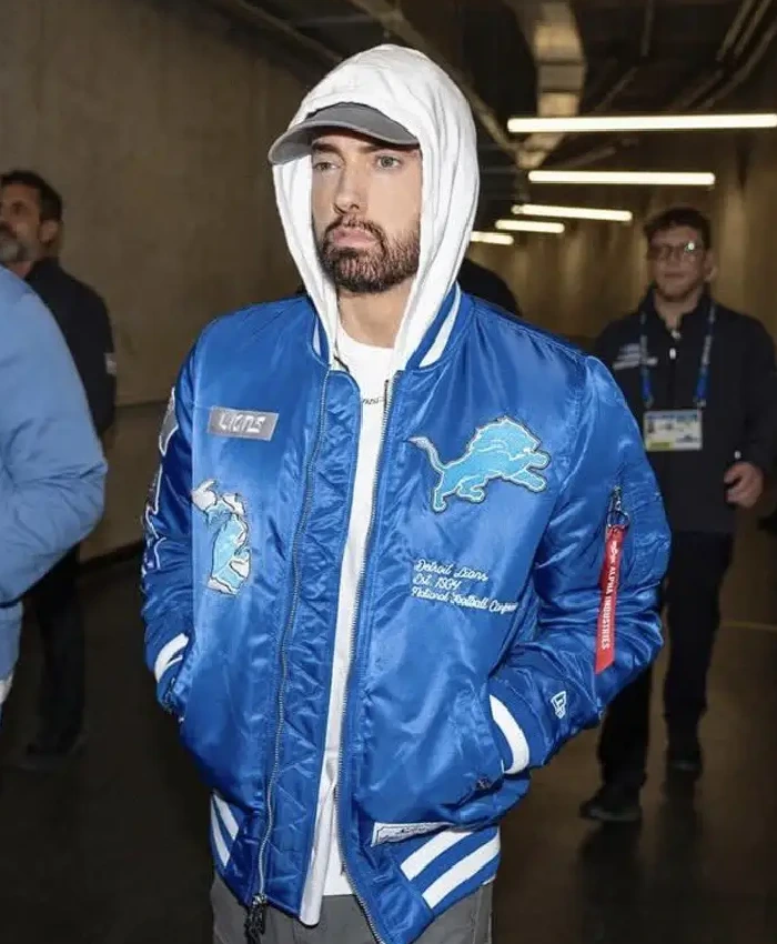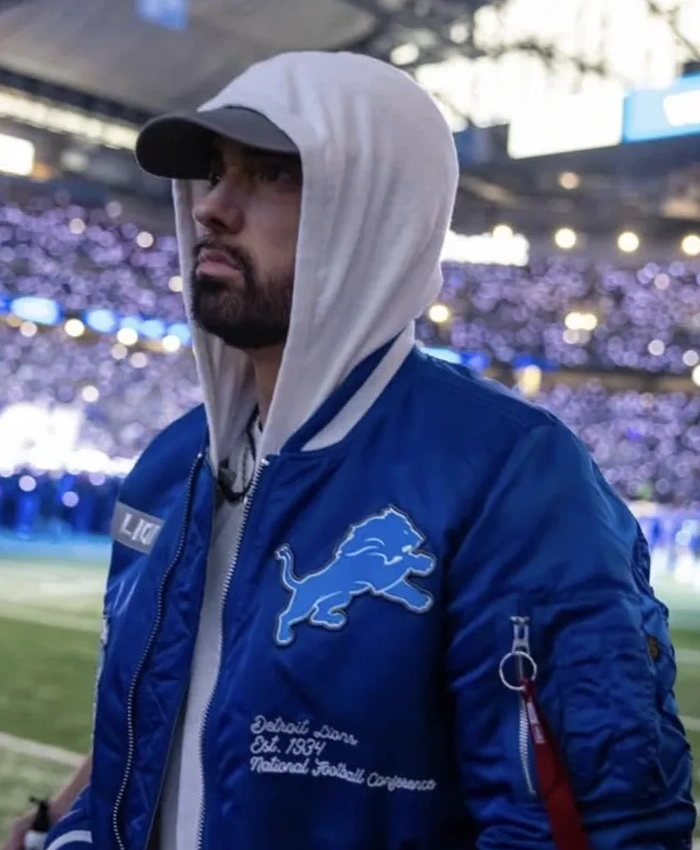 Moreover, the Detroit Lions Halftime Show Eminem Jacket solves that problem. By having a satin outside and a viscose lining that keeps the warmth even. The ribbed collar sits comfortably without putting too much pressure on it. And the full-length sleeves with ribbed cuffs let you move freely. Similarly, a YKK zipper keeps the front closed, and three outside pockets make it useful every day. The Eminem Detroit Lions Thanksgiving 2025 Halftime Show Jacket is blue and feels light but protective. Well, the Las Vegas Jacket sells this jacket for people who want comfort that is ready for action and a classic sports look.