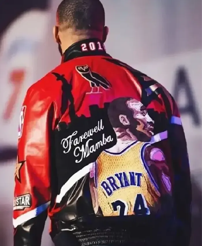 This Drake Farewell Mamba jacket hits different. Real leather red black combo bold button front erect collar racer feel. Viscose lining smooth rib cuffs good grip. Wore to events got nods from fans. Leather quality thick patina coming in nice. Pockets useful no bulk. Tribute vibe strong without overdoing.