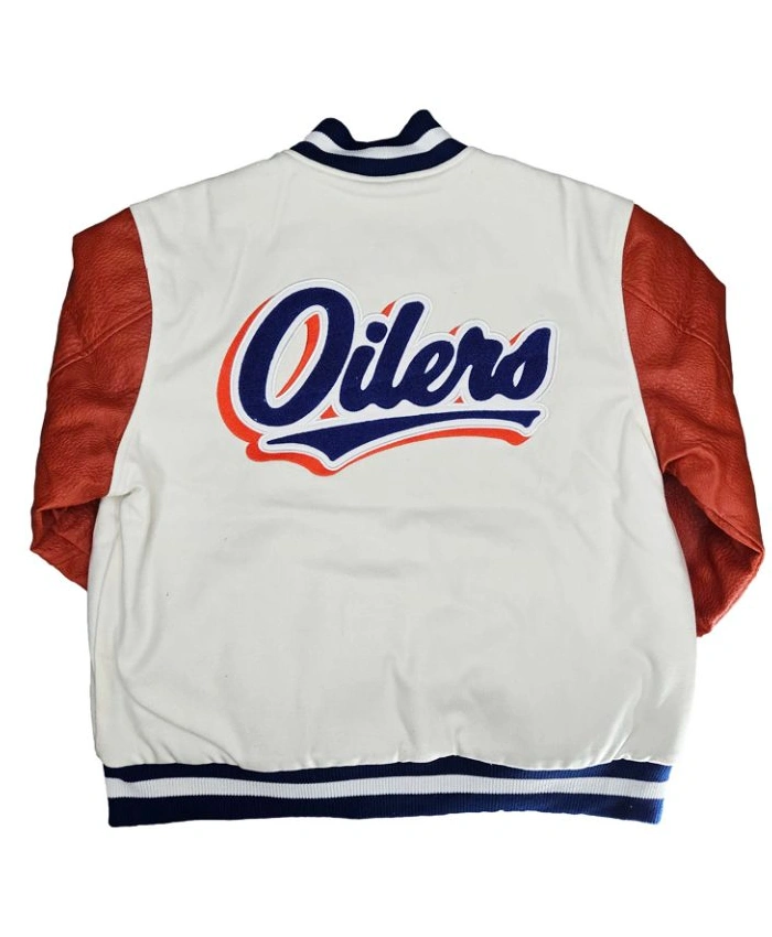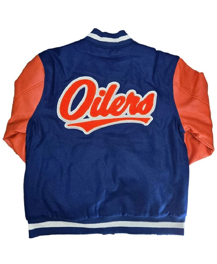 This varsity jacket has a wool body and real leather sleeves, which really gives it that classic coach-style feel with a touch of luxury. The viscose lining makes it super comfy for daily wear. And those full-length sleeves with rib-knitted cuffs really bring in some nice structure and warmth. This jacket has a stand-up collar and a snap-button closure, which really gives it that classic varsity feel. It goes perfectly with jeans, sneakers, or your cozy winter layers. Also, the two waist pockets add a bit of practicality while keeping the design looking sharp and tidy. Well, you can grab it in White and Orange or Royal Blue and Orange, showcasing the Oilers’ classic team colors in a stylish and easy-to-wear design.
