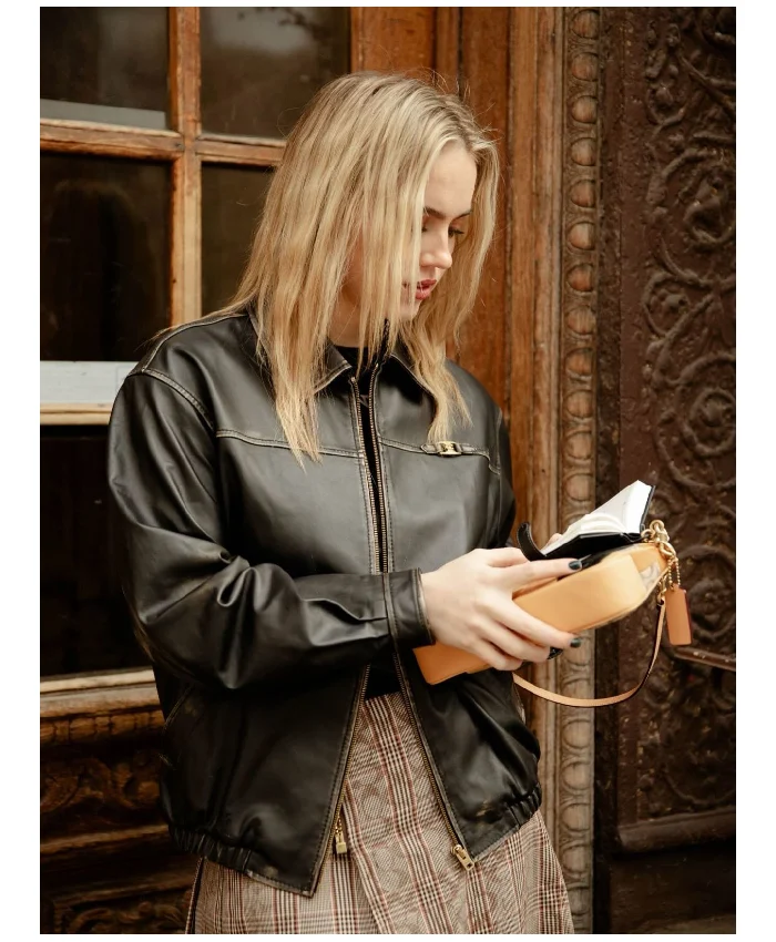 The first thing I noticed was the weight, it’s got that nice, substantial leather feel without being heavy enough to tire out your shoulders. The zipper is chunky and smooth and the two outside pockets are actually deep enough to be useful. I love the minimalist vibe of the shirt collar, you can flip it up if it’s windy or keep it flat for a sophisticated look. It’s definitely a high quality staple.