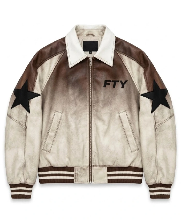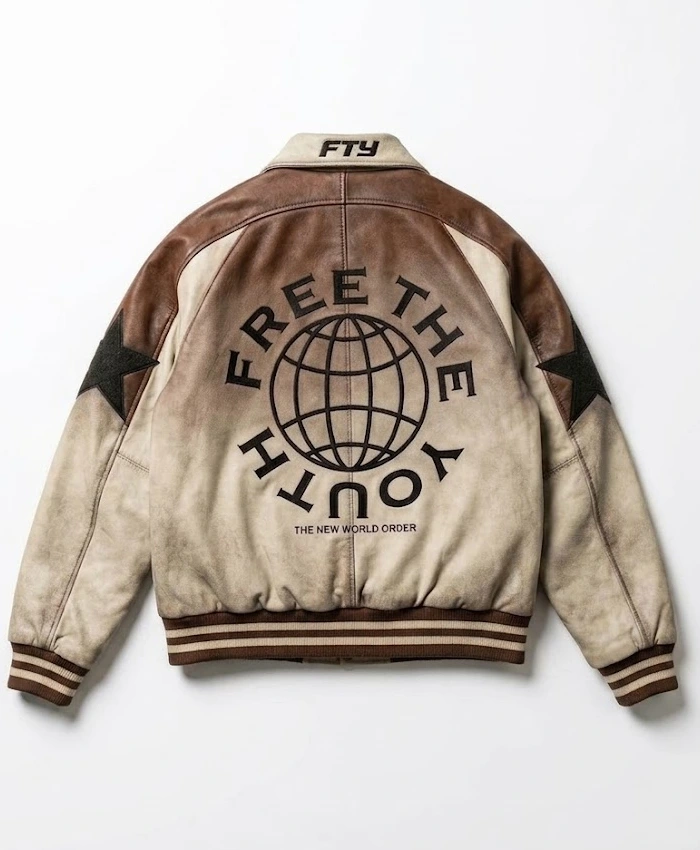 Free The Youth Brown and Off White Bomber Leather Jacket