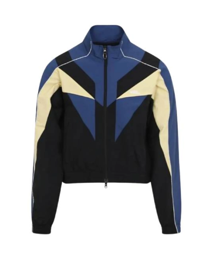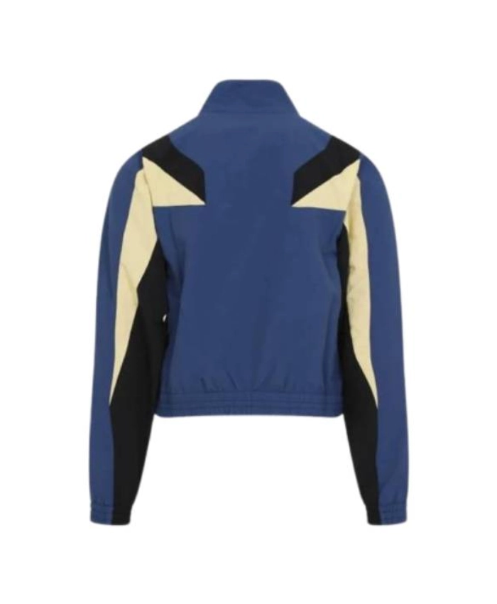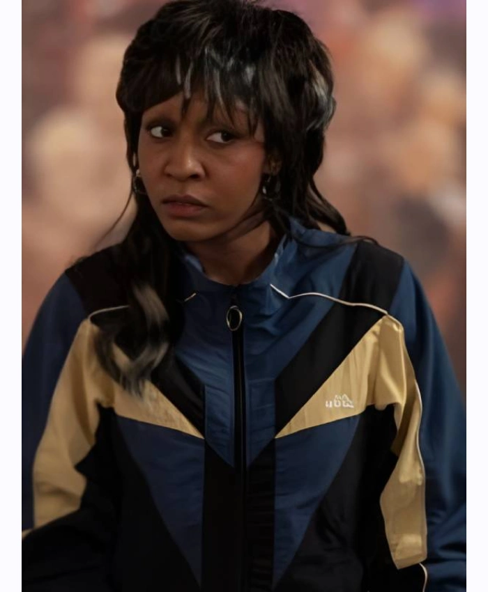 This Mimi Rush TV Series I Love LA 2025 Ayo Edebiri Colorblock Track Jacket is made of cotton and polyester with a smooth viscose lining. It is light, breathable, and comfortable to wear. Also, the full-zip front closure and stand-up collar make it look nice. And the colorblock design keeps it trendy and up to date. The elastic cuffs and full-length sleeves make sure that it fits well.