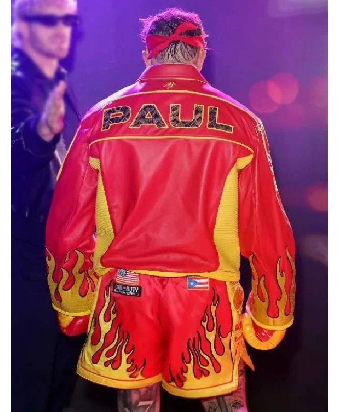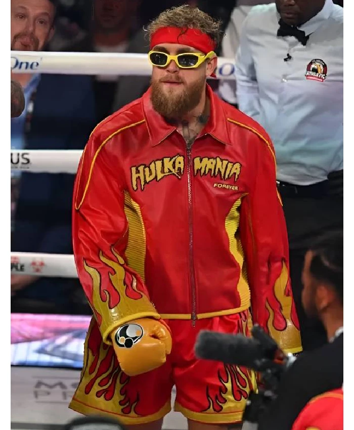 US Boxer Jake Paul Vs Anthony Joshua 2025 Flame-Printed Sleeves & HULKAMANIA Chest Logo Red & Yellow Tribute Jacket