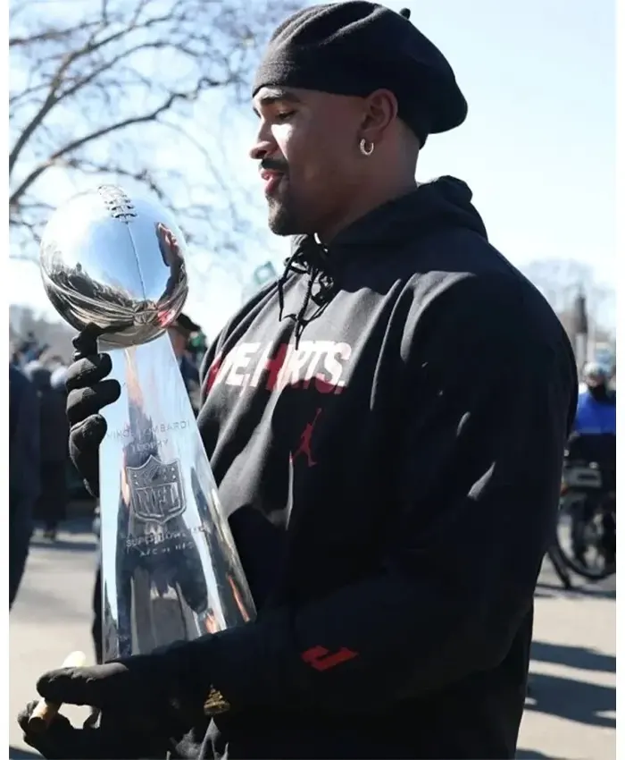 The best part about it is that you will become the center of attention. Just like Hurts, as he paraded with the Super Bowl trophy. You’ll feel that winner’s feeling, and your emotions are going to be all positive. You can tell your friends that you have the same hoodie that a Super Bowl winner wore, and they will admire and like you. The Jalen Hurts black hoodie is extremely comfortable, and you will want to wear it all day and even want it to be your companion as you set off to school or work.