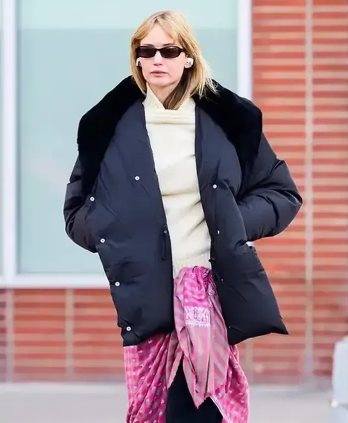 - Collar: Elegant High-Neck Funnel Collar (No Hood)