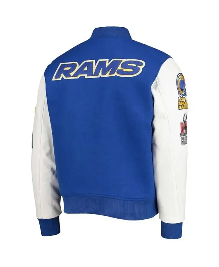 I’ve worn a lot of jackets like this Logo LA Rams Royal and White Varsity jacket, but this varsity jacket stands out big time. The color contrast is super sharp, and the white sleeves add that extra touch of style.