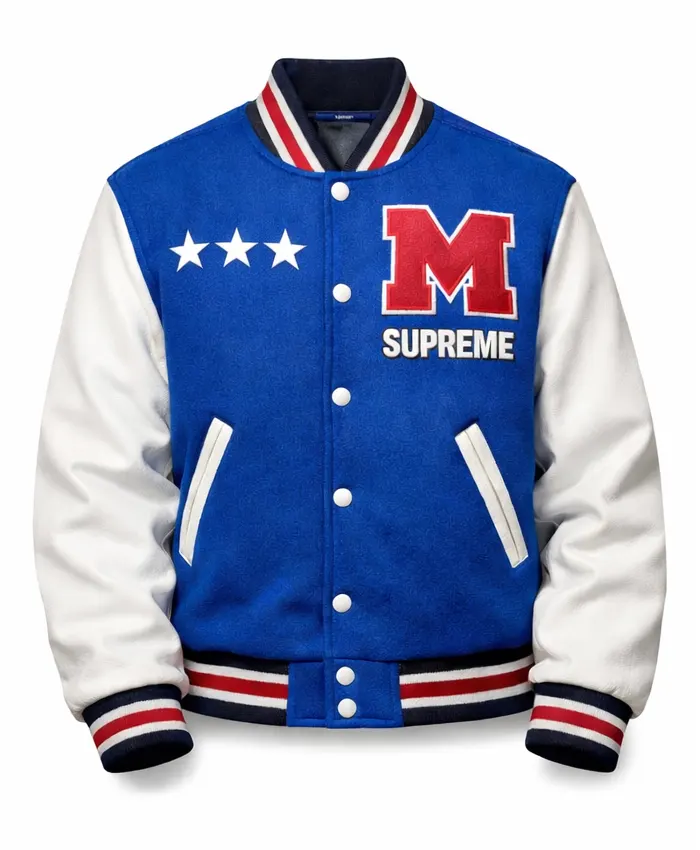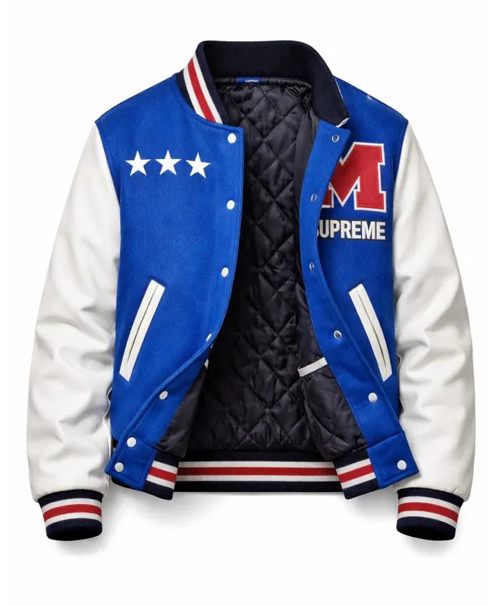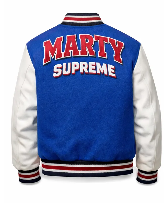 Now its time that we deeply look into its design and specs. The Marty Supreme Letterman Bomber Jacket is indeed a versitile and smart looking fashion statement. It is very densely detailed where the white and blue color tone has highlighted its overall appearace. Likewise, to ensure that you can easily style this jacket it comes with a buttoned closure and also features multiple pockets that allow you cpace to keep your accessories.