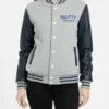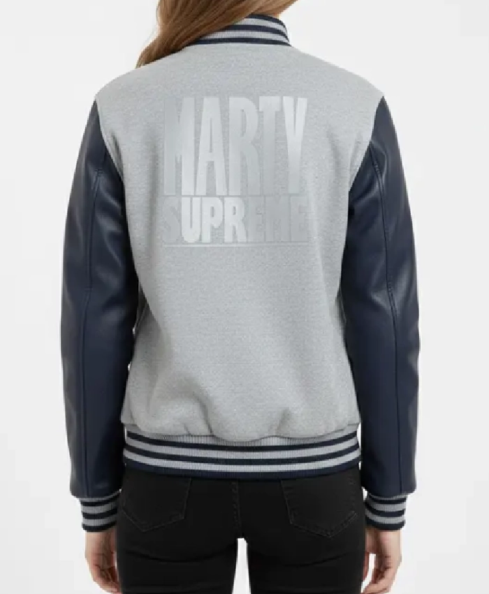 Marty Supreme Gray and Navy Blue Letterman Leather Sleeve Varsity Jacket