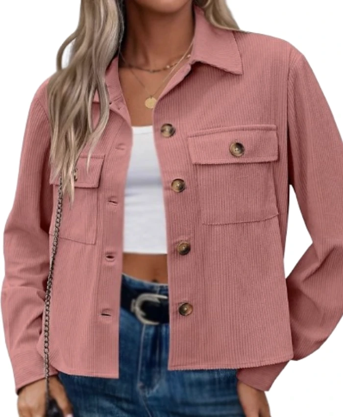 Moreover, the shirt-style collar and buttoned front closure reflect a classic design that fits beautifully with casual wear. Or semi-formal outfits. When paired with its long sleeves and rounded button cuffs. The craftsmanship truly stands out that offering a neat and polished appearance. Well, the balance between structure and comfort makes it ideal for cool evenings. Also, coffee dates, or outdoor gatherings, where you want to stay stylish without trying too hard.