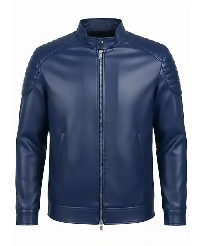 Navy Blue Slim Fit Quilted Shoulders Premium Leather Biker Jacket
