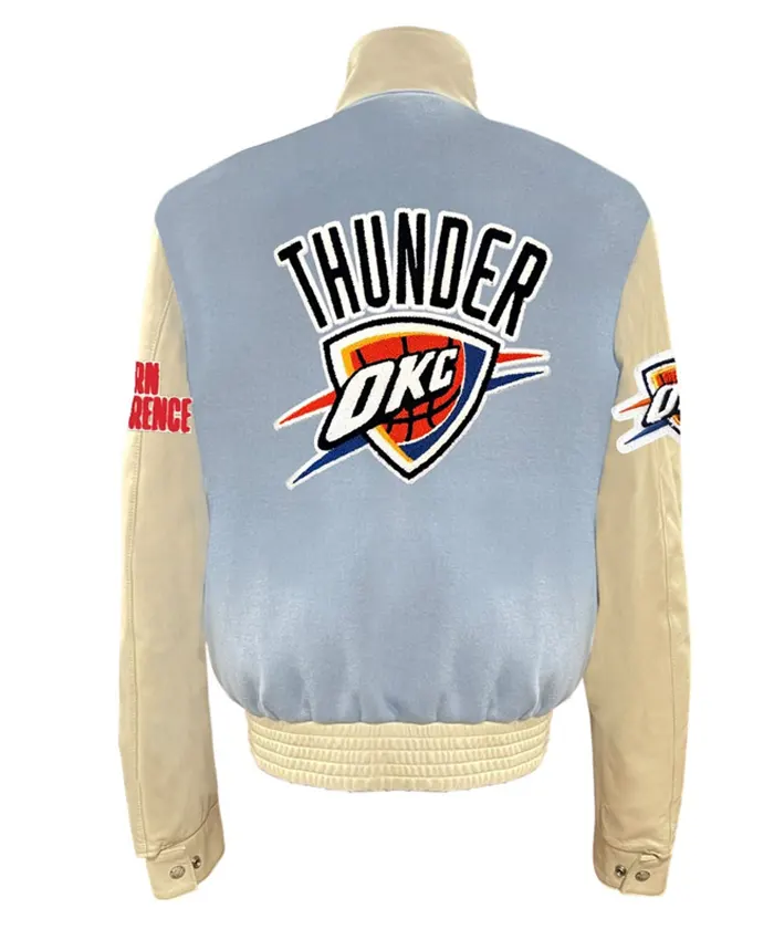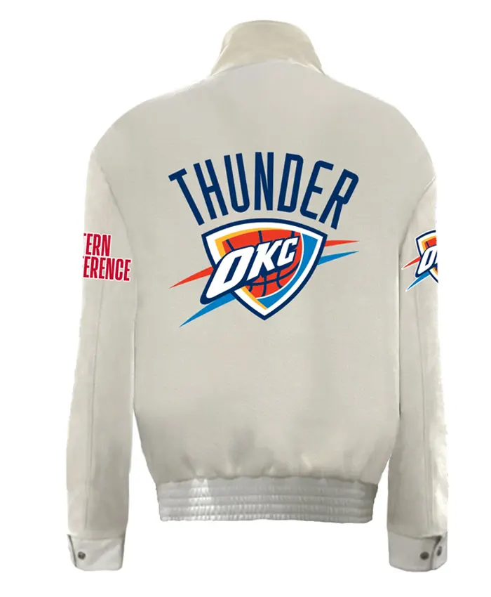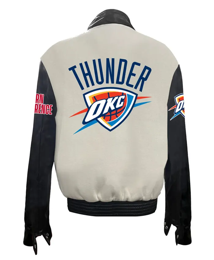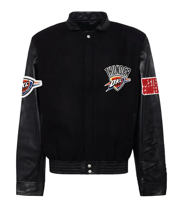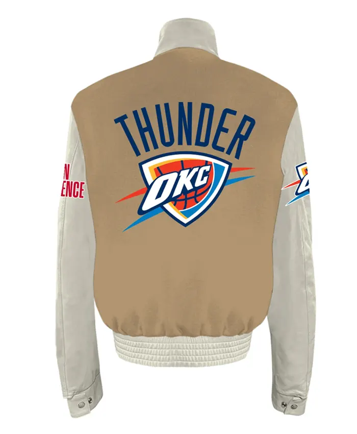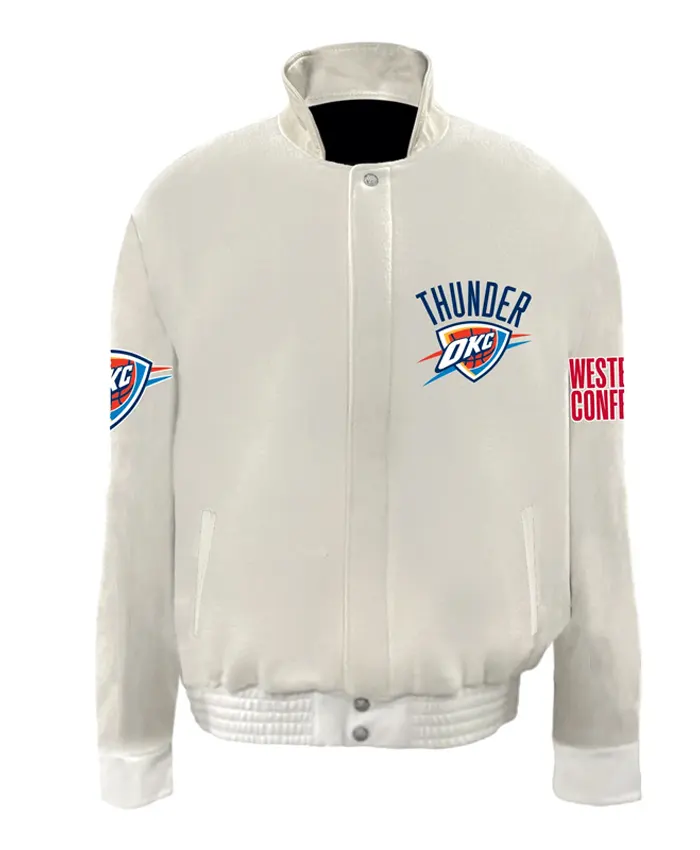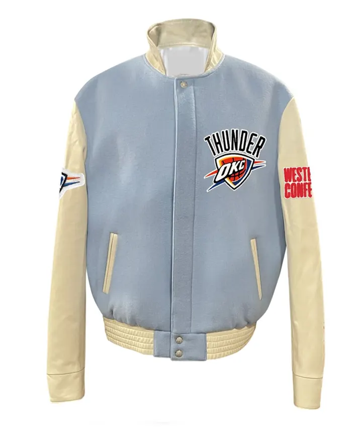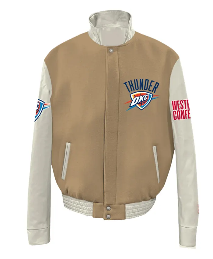 Energy crackles before tip-off, and your jacket matters. The Oklahoma City Thunder Varsity Jacket starts with sturdy wool paired with genuine leather sleeves. And a soft viscose lining for a fit that feels warm without weight. It secures with a snap-button closure that keeps the front clean. You’ve got some great color choices here: brown, blue, white, black, or even a classic black and white. Pick the one that suits your style best! Also, the full-length sleeves come together with rib-knit cuffs, and the stand-up collar keeps its shape nicely. Two outside pockets and two inside pockets keep essentials close. Also, the build mixes classic varsity form with practical details. So you can wear it to the arena or around town and city life.