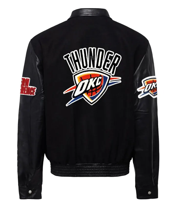 The Oklahoma City Thunder Varsity Full Zip Jacket traces its roots back to collegiate letterman jackets. And postwar teamwear that grew into an American tradition. Over the decades, the varsity became a symbol of team pride and personal achievement. This jacket really captures that history while still fitting well and having sleek trims. The real leather panels and wool body will last a long time. The viscose lining is also very comfortable, and the snap front is a nod to old-fashioned locking systems that still work well today. Designers used both traditional and modern tailoring to make the jacket feel both classic and new.