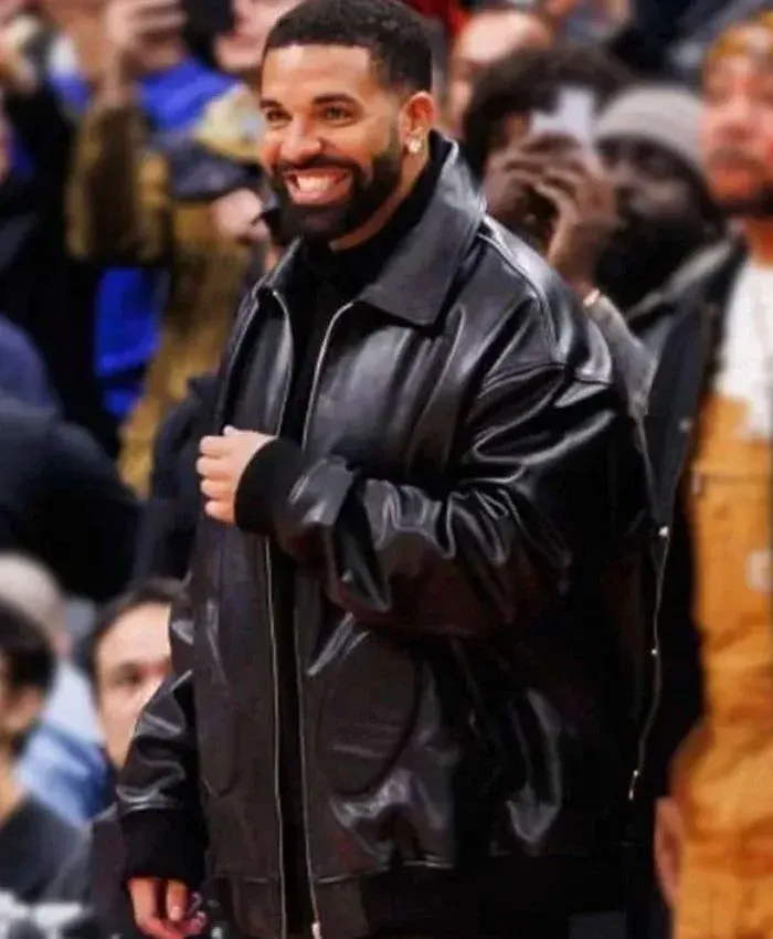 Drake NBA Raptors VS Warriors Game 2025 Black Leather Bomber Jacket