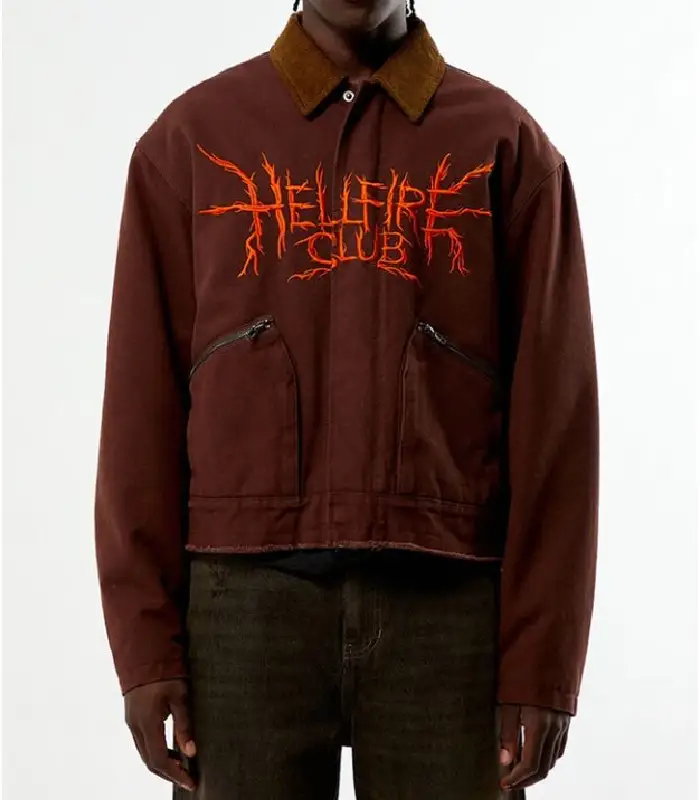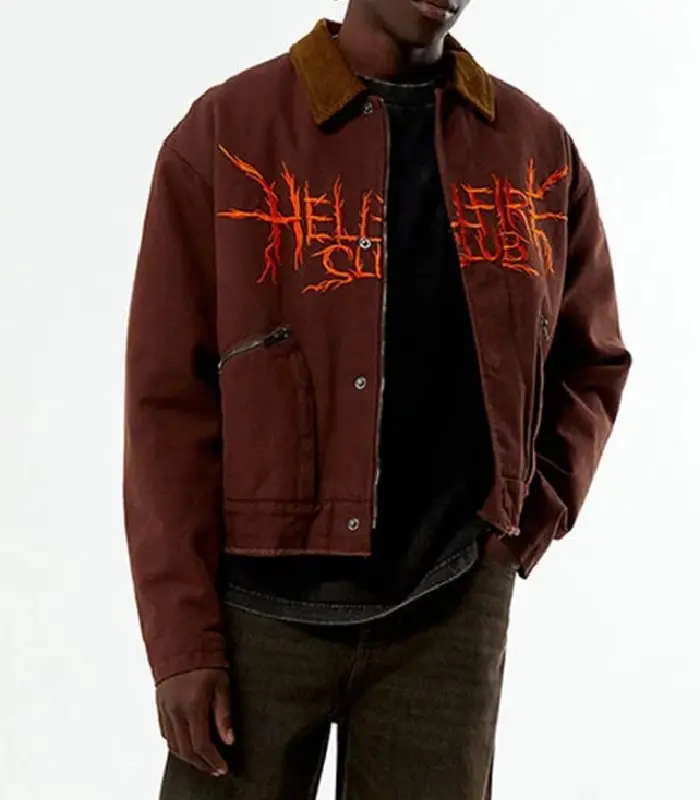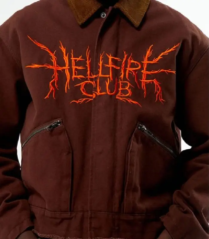Recreation – Buy Stranger Things Hellfire Lives Cotton Full-Zip Brown Jacket for Sale