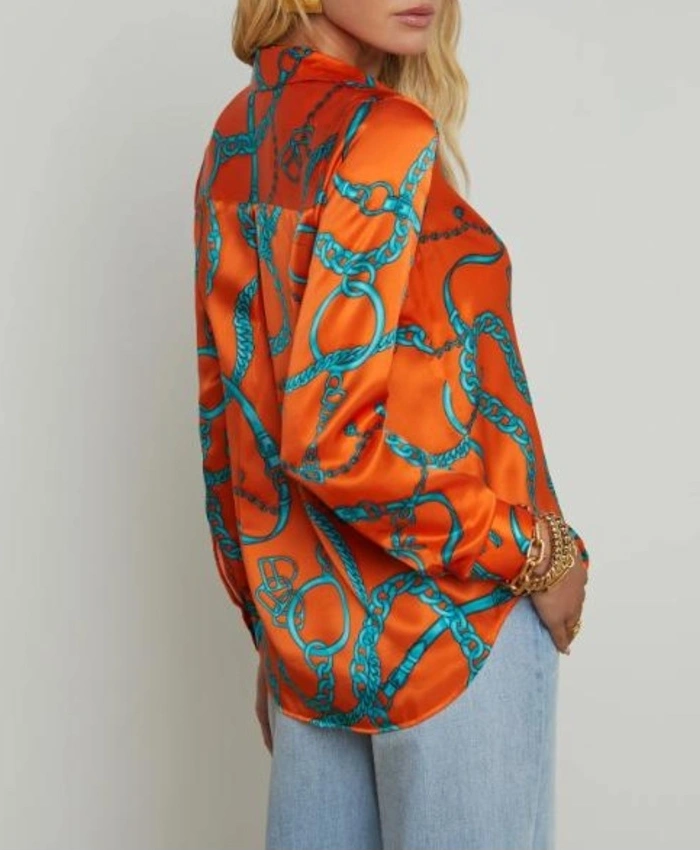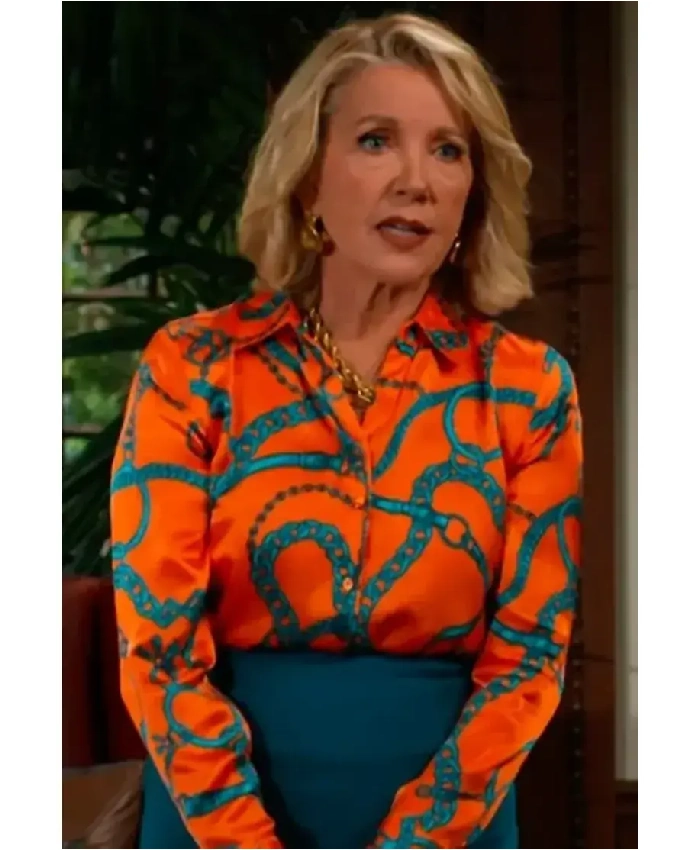 Melody Thomas Scott TV-Series The Young and the Restless 2025 Nikki Reed Newman Orange Chain Print Shirt