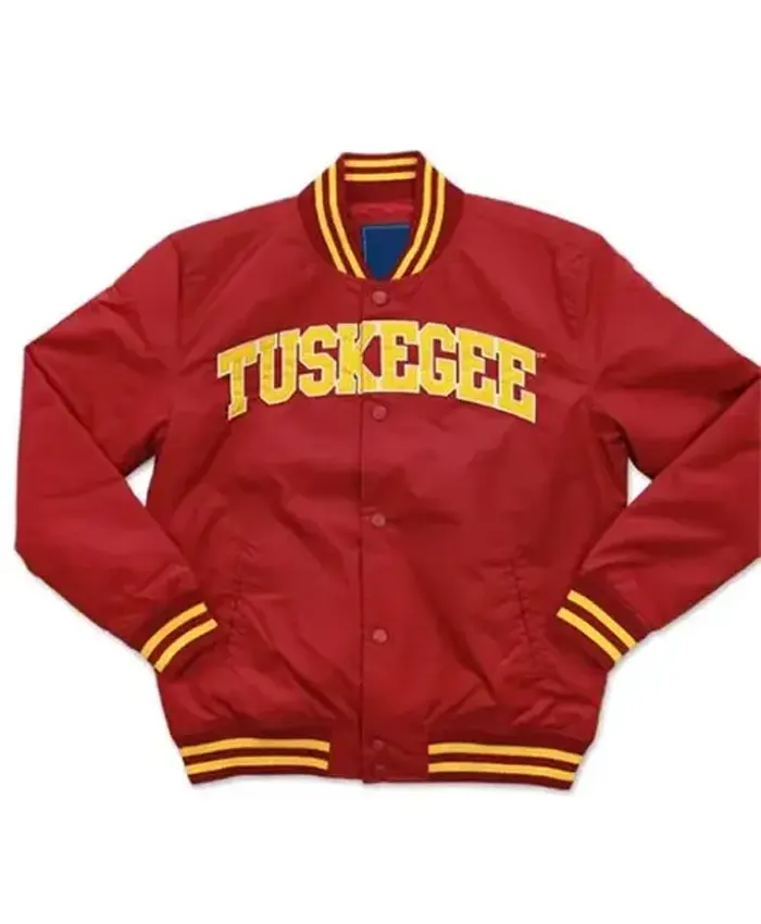 This red Tuskegee varsity jacket is premium satin with soft viscose inside. Snap tab easy rib accents polished pockets useful. Red pops casual outfits mein movement easy. Sizing chart accurate large fit great compliments on the university look. Solid quality arrived quick.