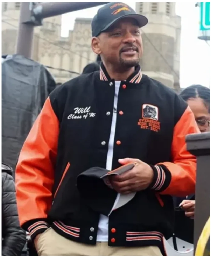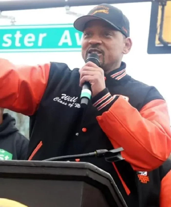 Got this Will Smith renaming ceremony varsity jacket to celebrate the “Will Smith Way” street honor and it’s awesome. Black wool body durable leather sleeves premium feel viscose lining super soft no itch rib collar stands nice snap-tab closure quick secure. Two outer pockets one inner plenty for phone wallet keys orange accents pop subtle. Relaxed fit true to size medium perfect for my build layers over hoodies without bulk. Arrived fast from the site no issues packaging good already wore it out got compliments on the West Philly vibe from friends who know the ceremony. Quality feels solid better than expected for a celeb inspired piece.