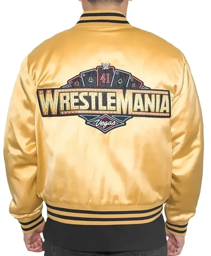 Las Vegas 2025 WWE WrestleMania 41 Gold Satin Varsity Bomber Jacket