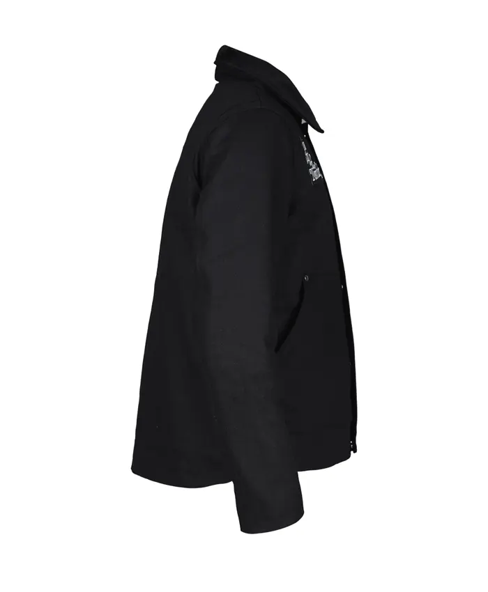 This black Carhartt inspired jacket is tough yet comfy for everyday. Cotton outer holds up well viscose lining soft no scratch full sleeves good length. Shirt collar casual look open hem cuffs easy movement zipper plus snap tab reliable. Two outside pockets handy one inside secure for wallet. Ordered for work vibes and it arrived fast no issues. Feels like real workwear but stylish enough for streets. Sizing true went with medium perfect fit.